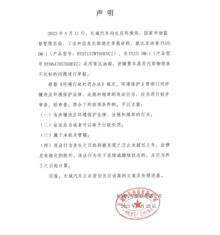 5月25日,汽车行业又爆出一个大瓜,长城汽车发表声明,公开举报比亚迪秦PLUS DM-i与宋PLUS DM-i两款插电式混动车型采用常压油箱,涉嫌整车蒸发污染排放不达标。作为中立的探长,已经和大家一样搬好小板凳,吃着西瓜看热闹。