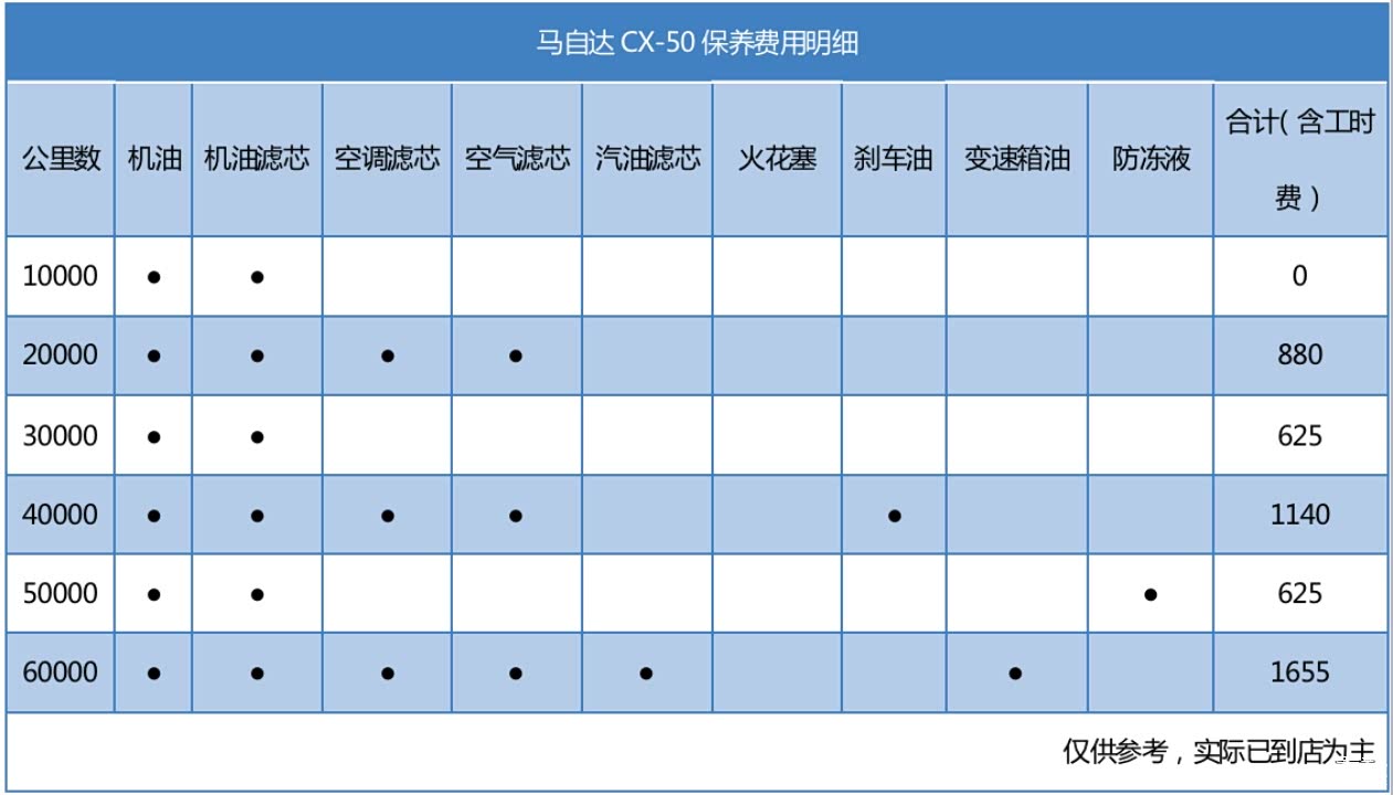 在保养费用方面,抛开厂家和经销商给出的一些保养优惠政策不谈。根据马自达的保养手册显示,马自达CX-50首保为10000公里,首保免费,之后保养周期为10000km。保养频率不高,并且保养费用也并不贵,其中最便宜的一次小保养为625元,所以最终的养车费用也可以得到控制。我们以一般家用车6年行驶60000km为用车周期,计算马自达CX-50的保养总费用,大约需要4925元,平均一年大约需要820元,这个保养价格在同级中还是比较实惠的。