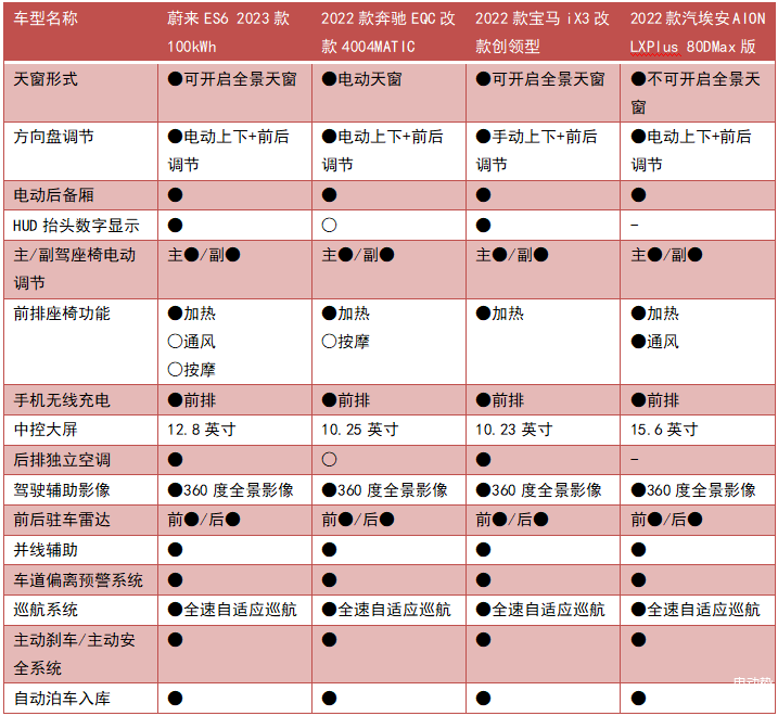此外,我们还将全新ES6与竞品车型配置参数作了一番对比,表格数据显示基本处于同一水平。