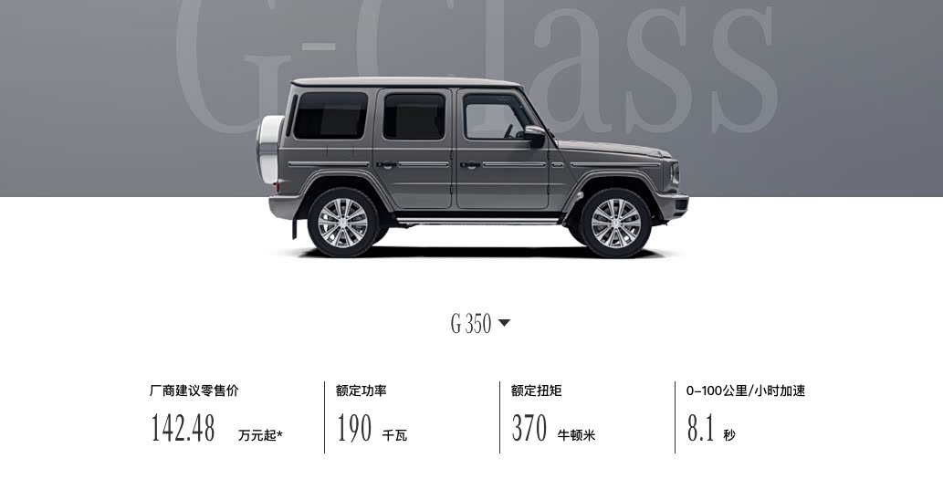 动力方面,2023款 奔驰G(图片 | 参数 | 询价) 350搭载2.0T涡轮增压四缸发动机,最大功率190千瓦(258马力),峰值扭矩370牛·米,传动系统匹配9速自动变速箱,官方0-100公里/小时的加速时间为8.1秒。