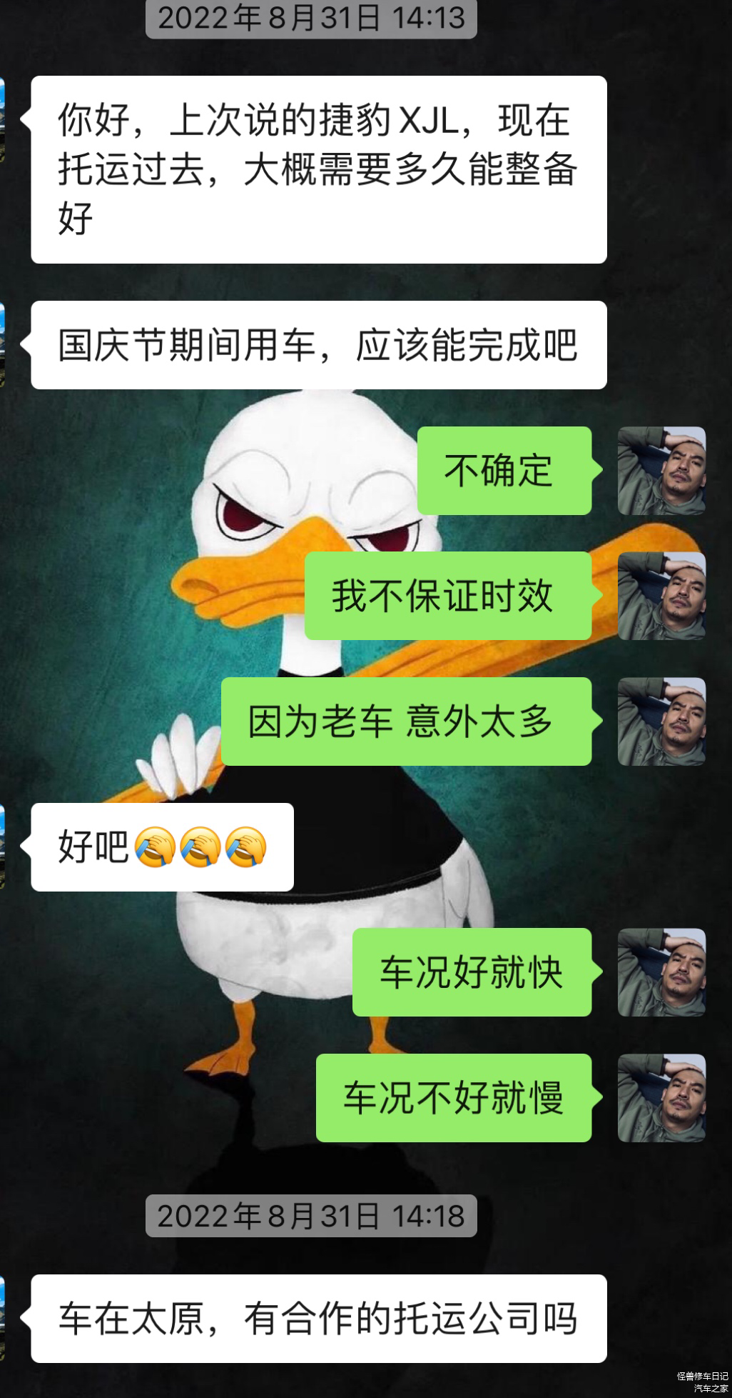 8月份的时候,车主与我沟通说有辆捷豹XJL,问了一些物流问题和整备时间问题。