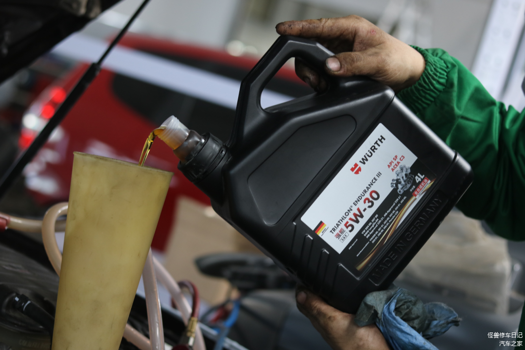 发动机旧油放干净,重新加入新机油。