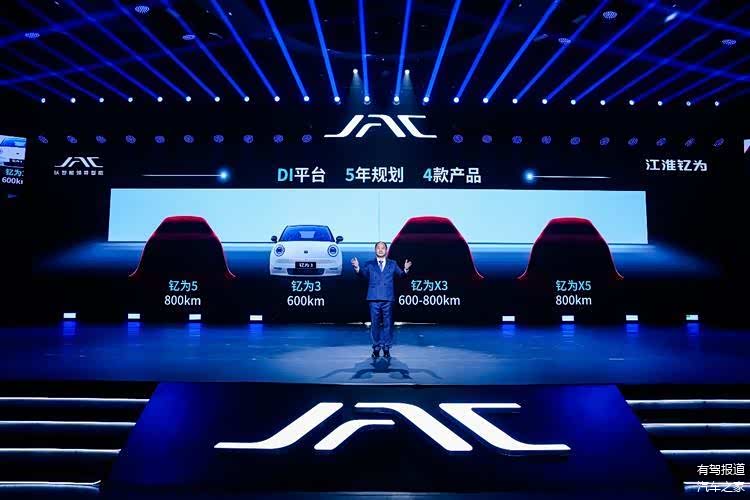 按照规划,江淮钇为将基于DI平台在5年内打造4款产品,分别为钇为3、钇为X3、钇为5、钇为X5。其中,钇为X3定位为智能纯电A级SUV,钇为5和钇为X5分别定位为智能纯电轿跑和SUV,最高续航为800公里。