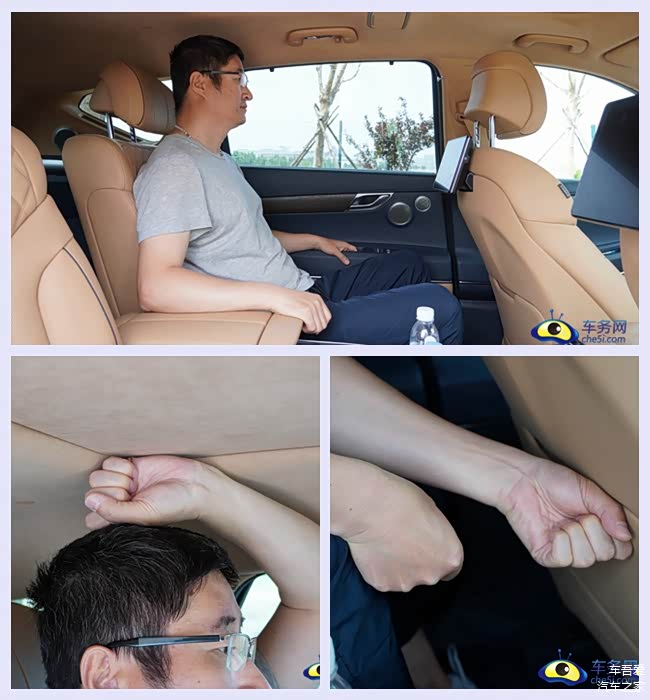 人物空间方面,体验者身高178cm,将座椅调至合适位置后,头部空间为1拳4指将近两拳的距离,空间没的说。保持前排座椅不变,同一体验者来到后排,头部空间为1拳,腿部空间为2拳多,整体效果还不错,但是后排头部空间略微局促。腿部空间非常可观。