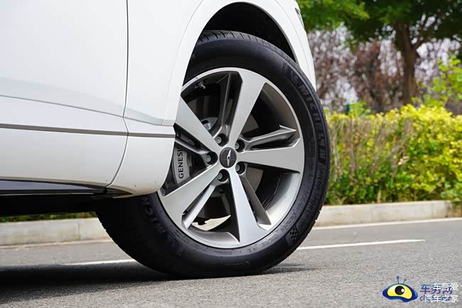 另外,捷尼赛思GV80搭配了22英寸钻石切割样式的光速银或是永恒银轮毂,运动感十足。同时,匹配的是米其林PS4高性能轮胎,规格265/40 R22。而豪华版车型则标配的是19英寸钻石银轮毂。另外,前轮配备了(四活塞)刹车卡钳。