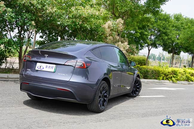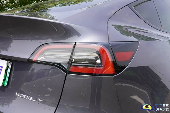 车尾方面,Model Y作为运动型SUV, 整体轮廓更显敦实,后轮拱上方的肩部线条与车尾的顶部区域相结合,形成鸭尾状的扰流板,鹰嘴式的尾灯看上去有些偏小,但锋利的内外灯角加上略带熏黑的灯腔处理还是增强了整体的点亮效果,车尾下方带有外扩的后包围,并使用了一块上扬的黑色护板覆盖,使得尾部区域更显紧致。另外,充电插孔在左后方尾灯处,同时有双插孔支持快慢充。