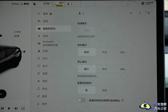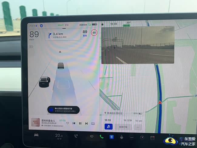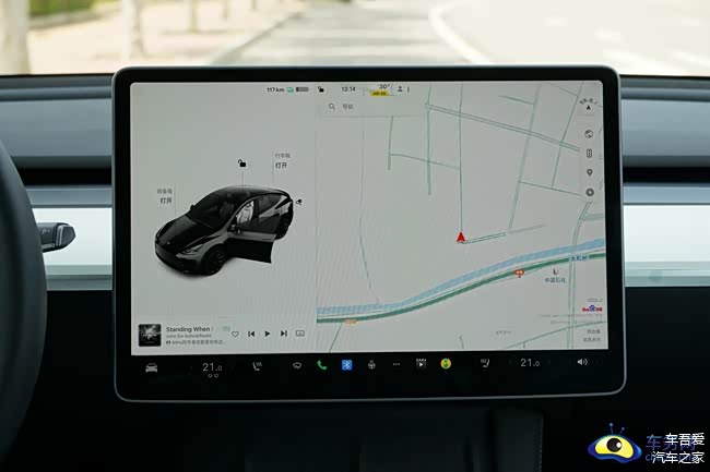 中控屏集成了仪表功能、车速、挡位、电量等信息显示在左侧。这也颠覆了所有车辆没有仪表的先例。其实,后面如果升级真的可以装载一块仪表或HUD抬头显示,这样不会在歪头看中控屏了。