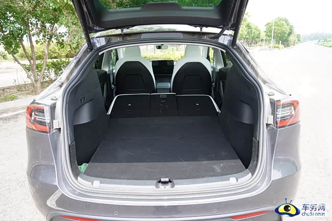 作为一款SUV,Model Y在行李厢方面有着天生的优势,官方给出的数据为1919L。后排座椅支持4/2/4比例放倒,在运载较长的物品时,例如鱼竿或滑雪板时,只需要把中间座椅折叠即可,两侧依旧可以座人,实用性更佳。同时行李厢两侧也设计了小的储物格,方便放一下随车工具或杂物。打开行李厢隔板,下面还有两个较大的储物格,空间非常可观,可以放一下比较私人的物品。与Model 3一样,Model Y在车头的位置同样提供一个行李厢空间,内部有部分配件,目测放下一个登机箱没有问题。
