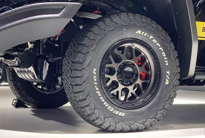 新款车型的尾部设计依旧方正,底部同样匹配竞技型后杠,尾灯组为竖直状布局,内部设置C字形灯带,点亮后视觉效果不错。除此之外,新款车型还将轮距调整至1738mm,并且匹配百路驰KO2轮胎,其规格为285/70 R17。