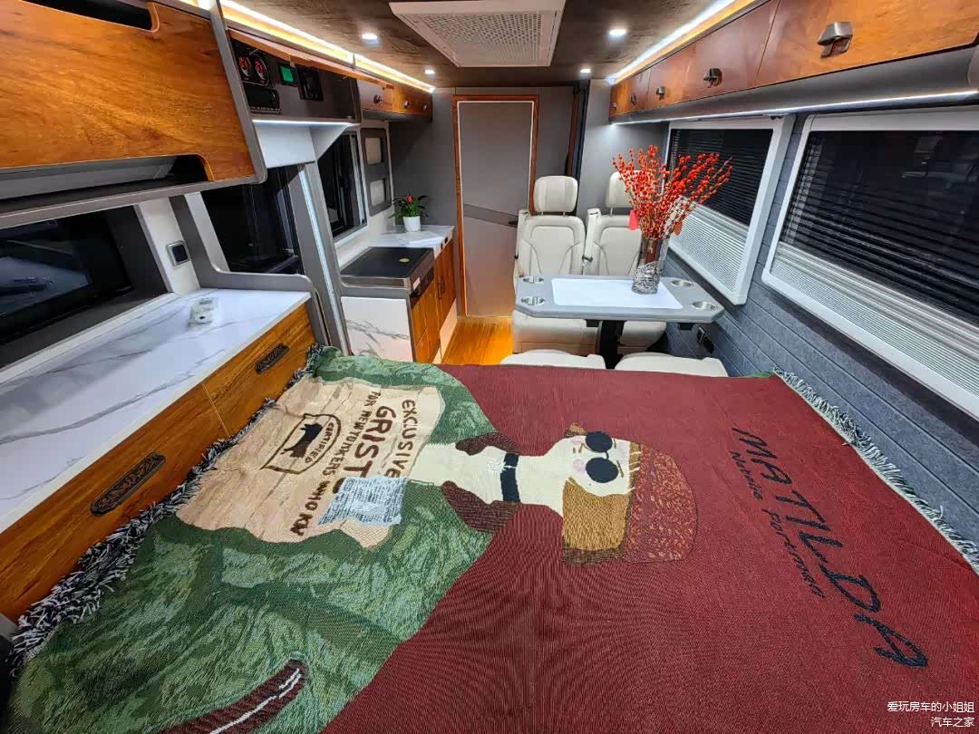 主卧大床空间宽敞,卧室内有两大窗户,保证通风良好的同时可让你欣赏到美丽的自然风光。同时,房车上还安装了家用变频空调,让你在野外炎热的夏天里也能够感受到空调的清凉怡人。