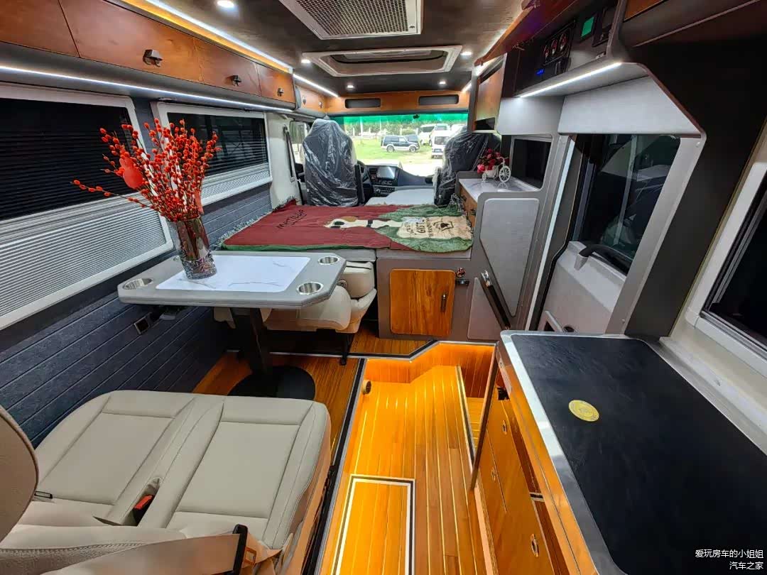 这款功能强大的霸王龙6X6越野房车,配备奔驰商务座椅,并且连接主副驾后方及利用奔驰座椅和发动机盖的空间,在需要的时候可秒变一张双人大床。床尾部还配备一个平台,使它成为一个非常实用的办公平台或孩子学习书桌。上方配有一个家用变频空调,可快速降低温度,并提供最佳的睡眠体验。