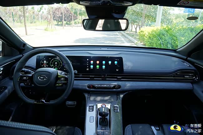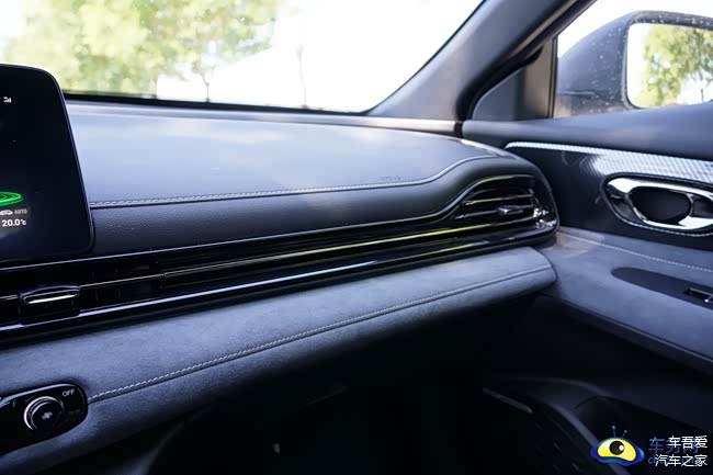 车内中控台下方以及门板处,还加入了翻毛皮的材质,配合少量的仿碳纤维纹路的装饰板,把驾驶氛围营造恰到好处。不过方向盘并没有采用翻毛皮材质,这一点稍微有些遗憾,希望后续能有所改进,或者说作为选装出现也都可以。