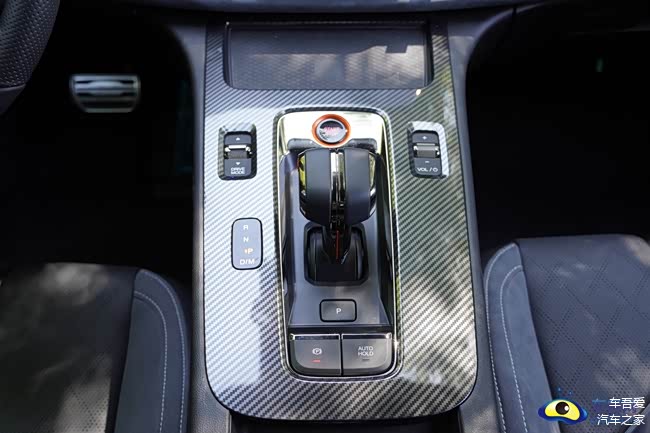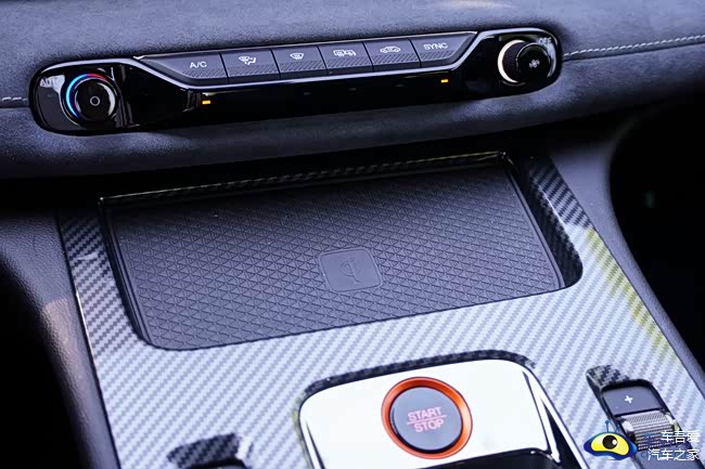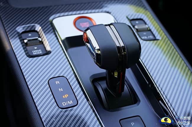值得一提的是,档把位置区域配备了一块亮面碳纤维纹路饰板覆盖,启动按键在换挡杆前方,两侧分别为驾驶模式以及媒体音量调节按键,整体设计简洁明了且精致,让驾驶者一目了然。