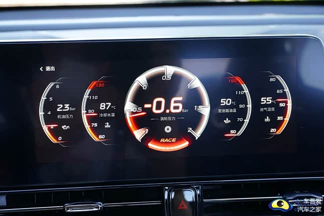 在PACE模式下,中控屏会切换为五连表,分别显示涡轮压力、机油压力、水温表、变速箱油温以及进气温度等十分硬核。