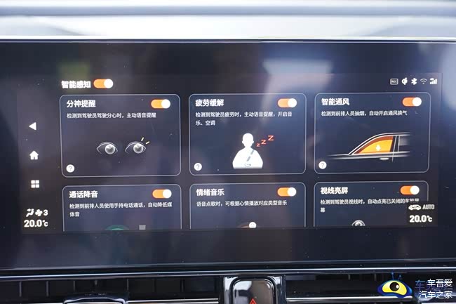 智能感知,采用了红外提醒,图上所述的所有感知功能均可以智能提醒,包括分钟提醒、疲劳缓解、智能通风、通话降音、视线亮屏、手势切歌、手势切地图、手势拍照、高速路分心等预警功能。