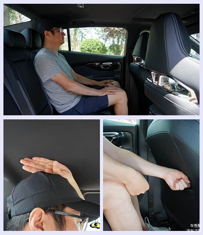 体验者身高178cm,将座椅调试到最舒适位置后,头部空间为1拳左右。保持前排座椅不变,同一体验者,来到后排,头部空间为4指余量,腿部空间为2拳多的距离,整体大小空间非常不错。