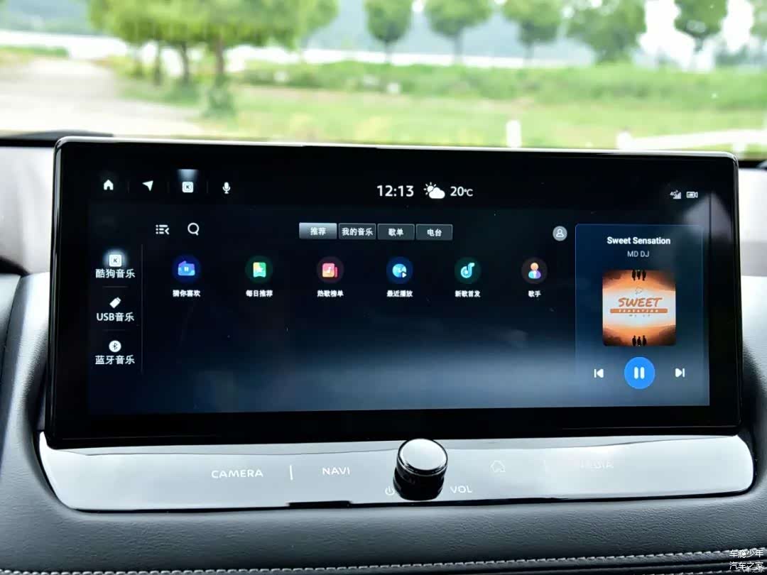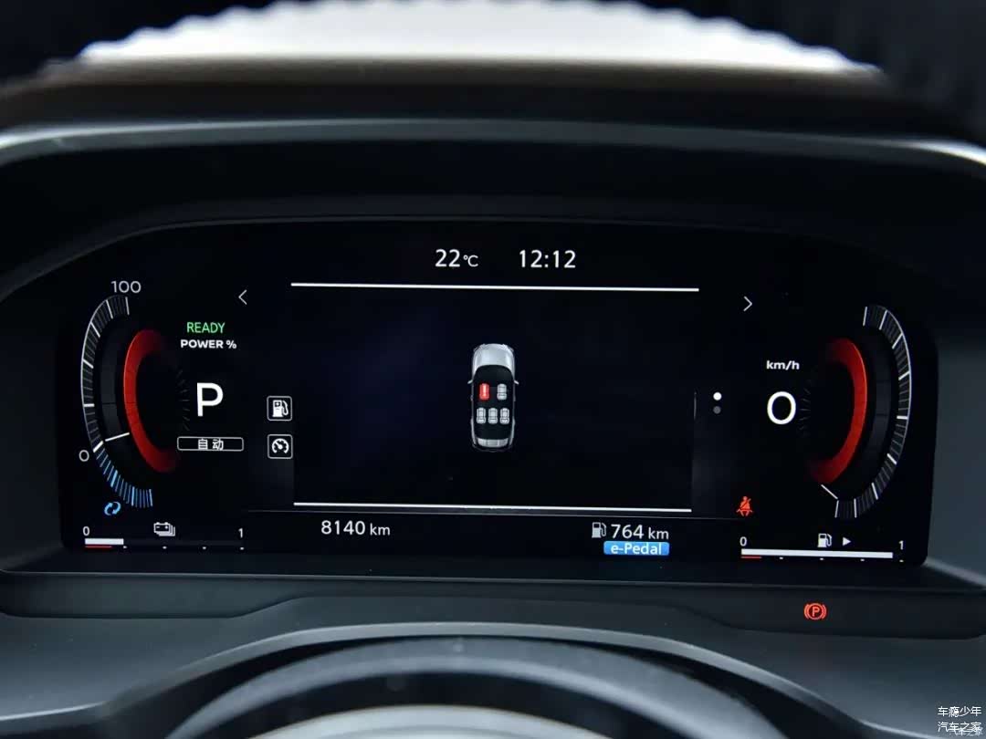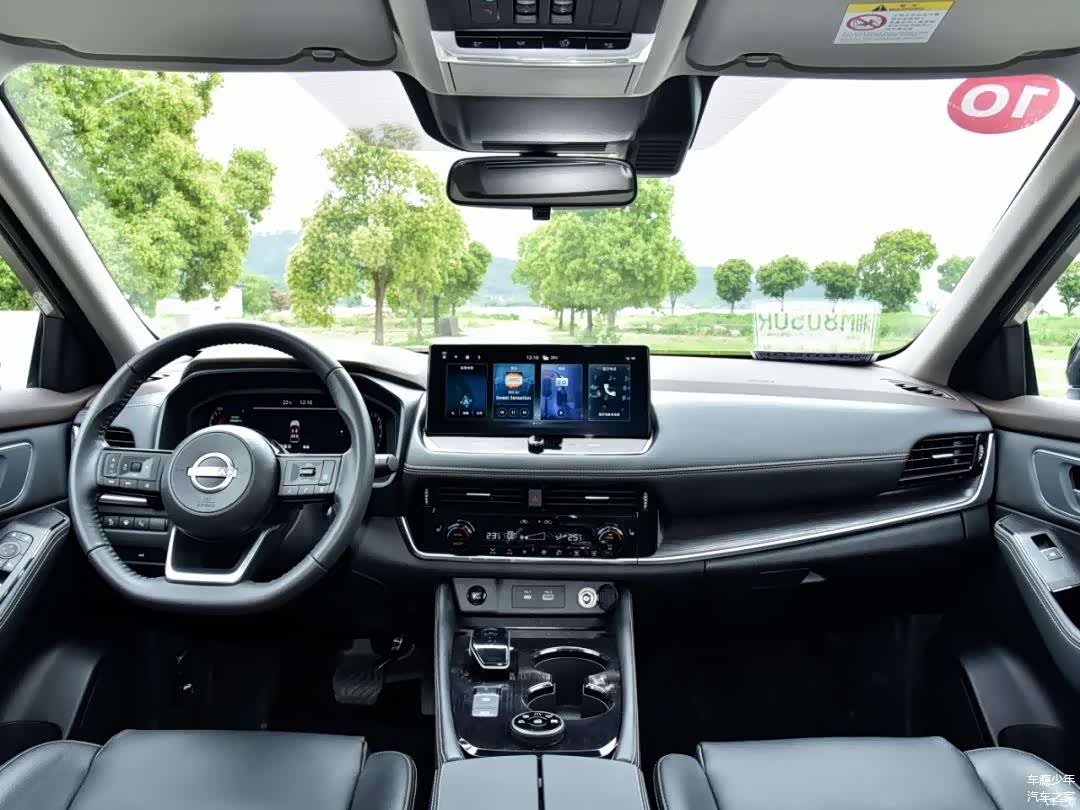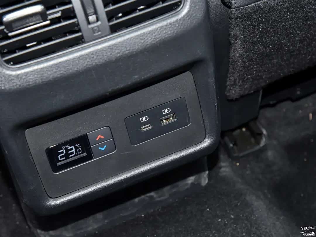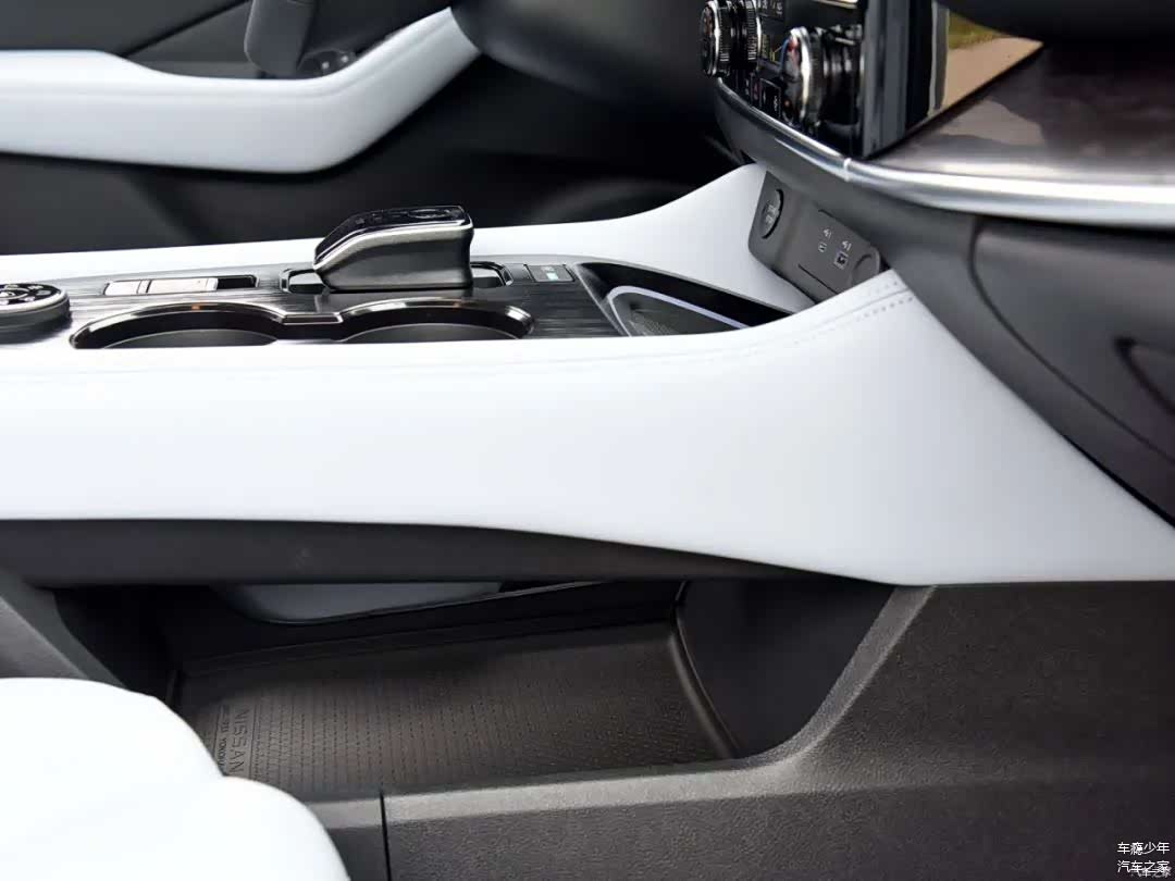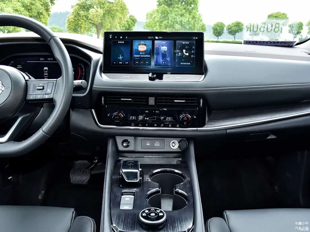 方向盘前方是12.3英寸(高配)的全液晶仪表,中控屏幕也是12.3英寸的,显示效果比较全面且细腻;在当今这个年代,超混电驱奇骏依旧在空调区域保留有物理按键,一定要给个赞,因为笔者觉得此类常用功能物理按键会更加便捷/高效;再往下是启动按键、点烟器、USB/Type-C接口和无线充电板。