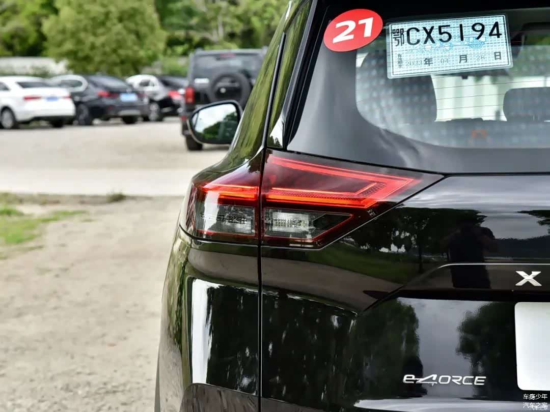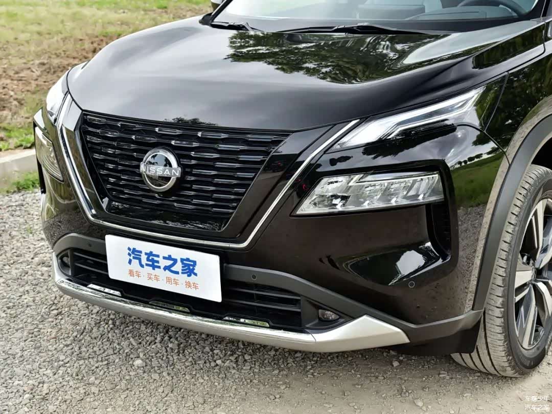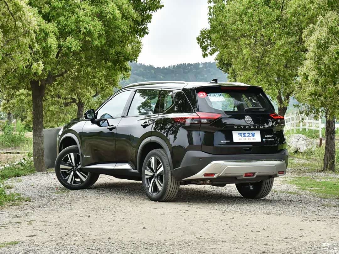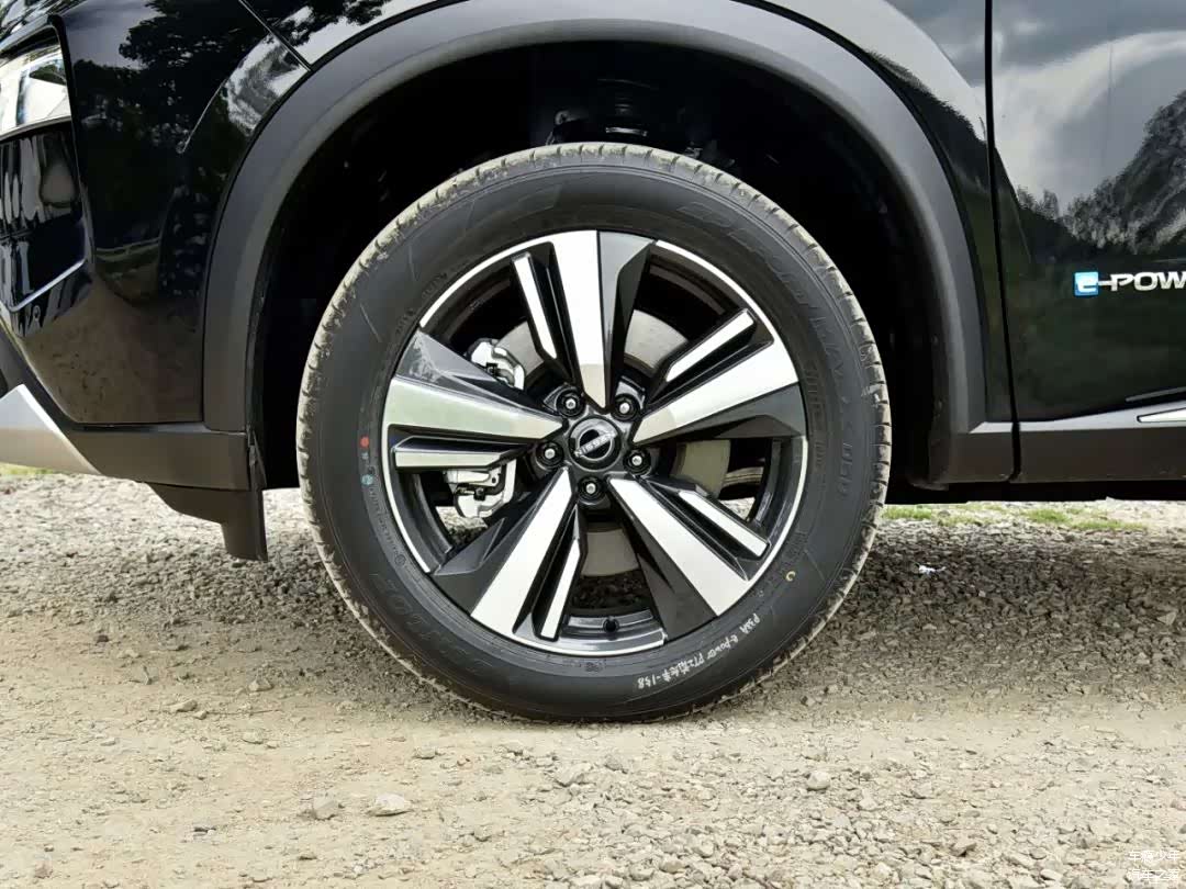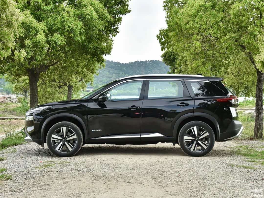超混电驱奇骏的侧面线条也是比较有运动感的,尤其是错开的腰线和侧裙处的镀铬饰条,在黑色车身上能很好地凸显侧面线条的肌肉感;在车门上还可以看到e-POWER的专属标识;高配车型配备的是19寸五辐轮圈(低配为18寸),轮胎规格为235/55 R19;这款车型的车身尺寸为4681/1840/1730mm,轴距2706mm。