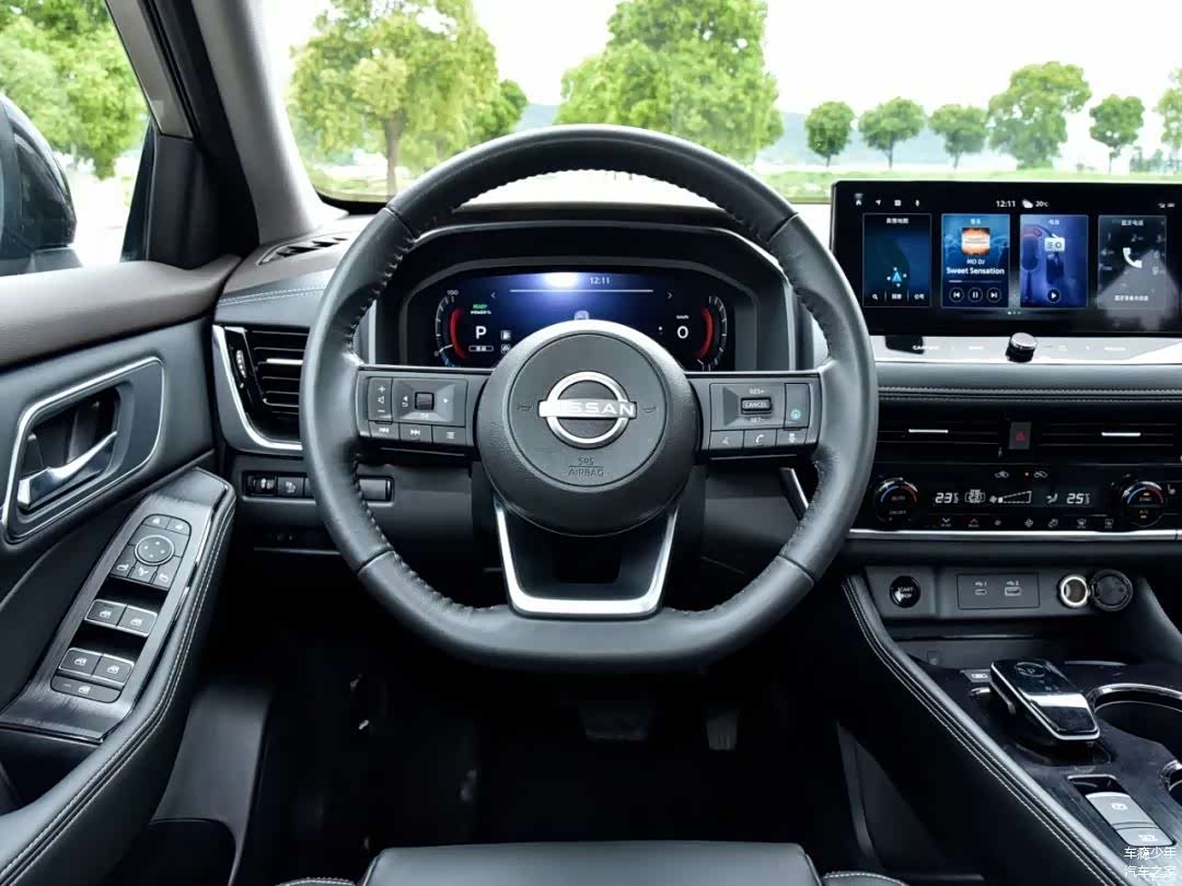 熟悉日产的朋友对超混电驱奇骏的内饰设计肯定不陌生,整体来看依旧以实用性为主,同时在一些细节之处也很有设计感。首先,这款车型配备了三辐式方向盘,在3/9点位置有多功能按键,下方是镂空和平底的设计。
