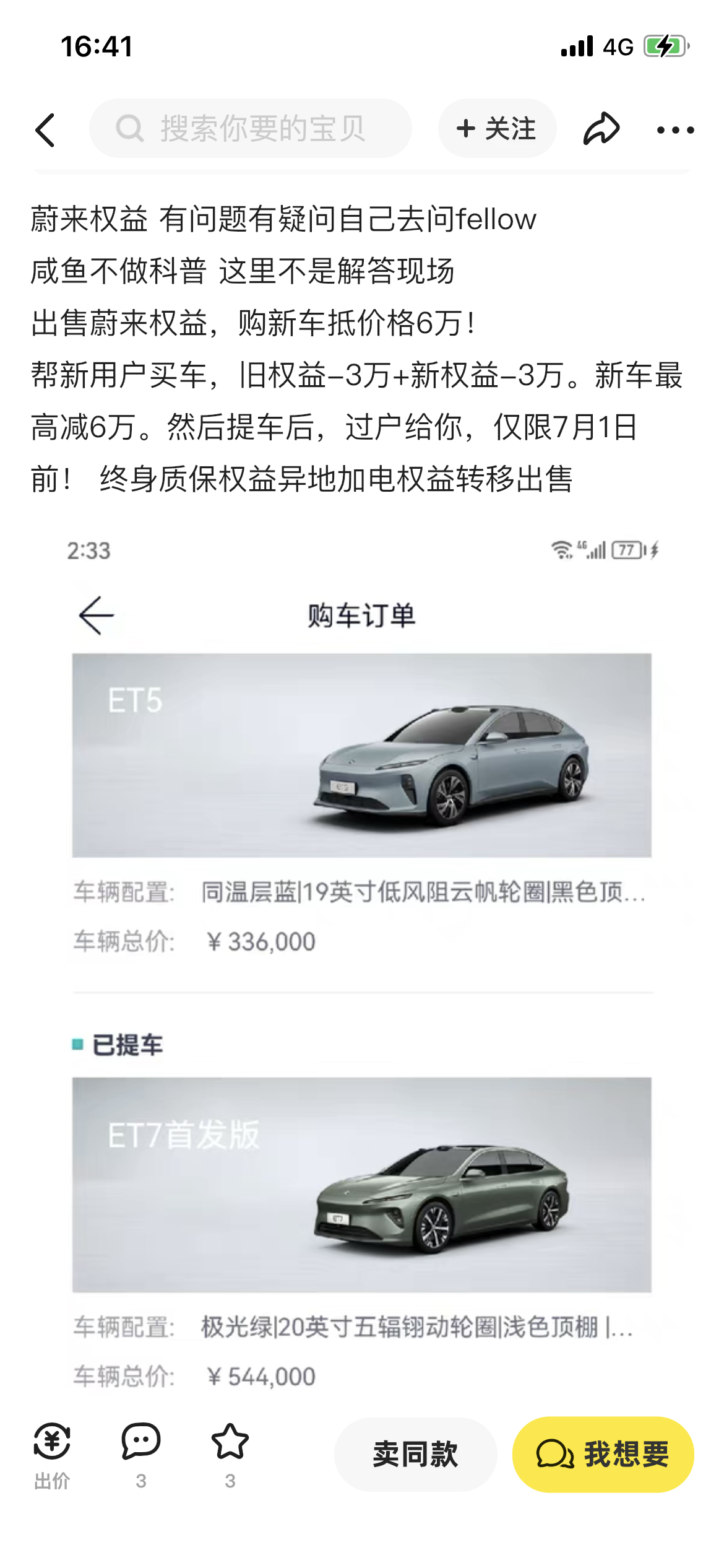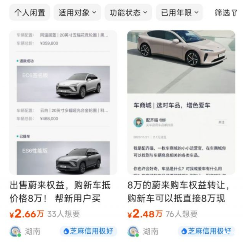 所以一些蔚来老车主,开始在某二手交易APP出售自己的购车权益。