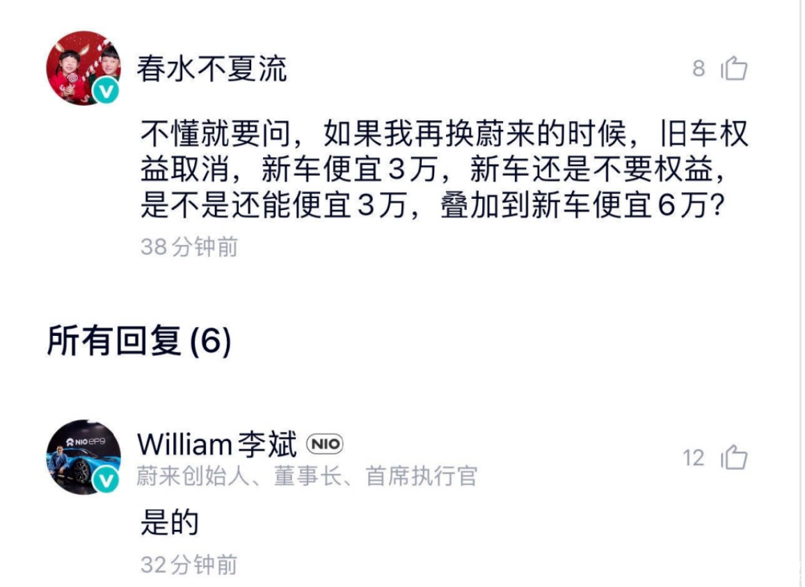 但蔚来还是记得住老车主的!老用户更换蔚来新车的时候,旧车权益取消,新车便宜3万,新车不要权益还能便宜3万,叠加到新车就是便宜6万元!