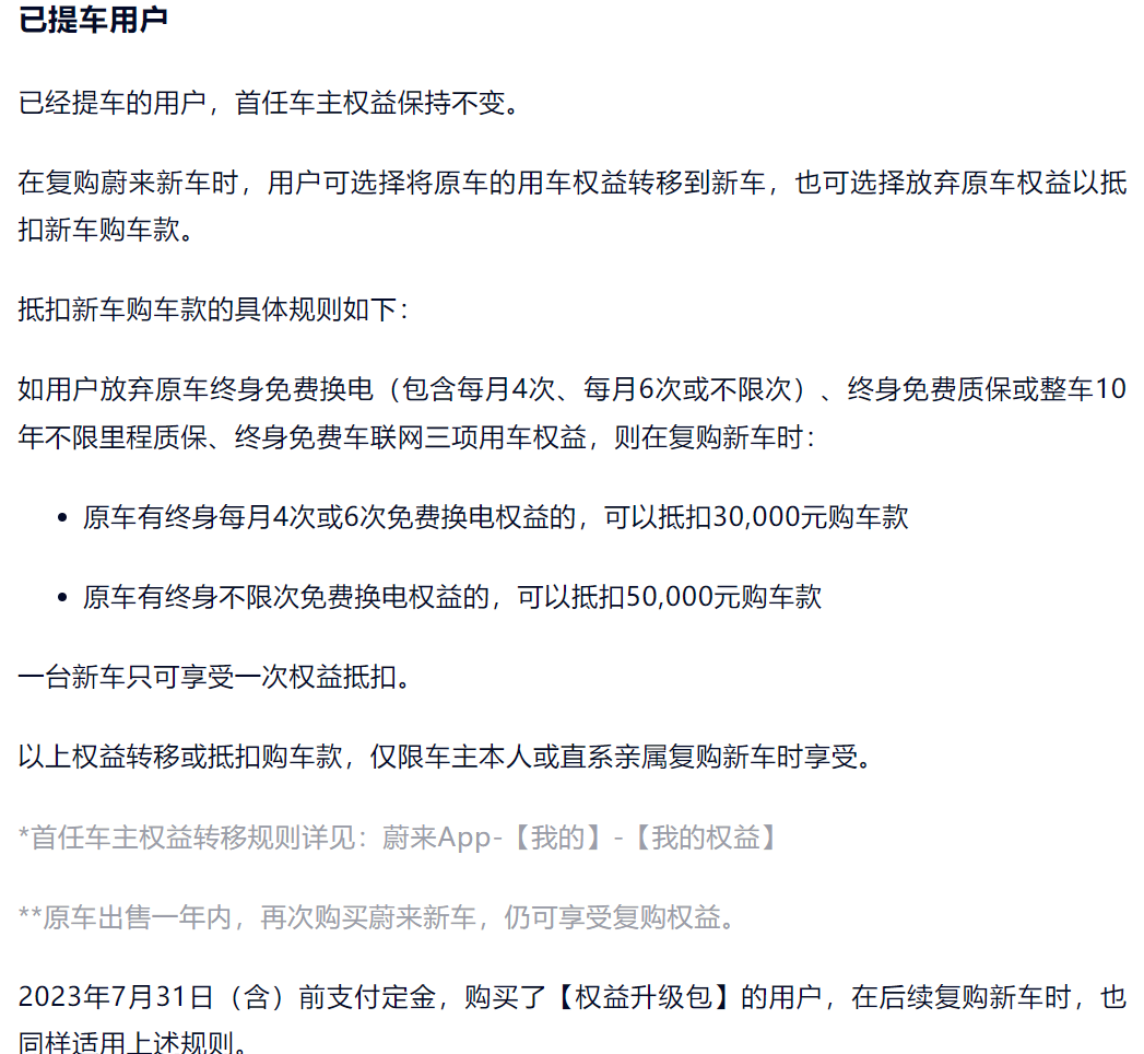但有部分车主例如创始版车主,拥有终身免费换电的车主放弃权益将获得新车车价优惠5万元,新车在不要权益再便宜3万,叠加到新车就是便宜8万元!