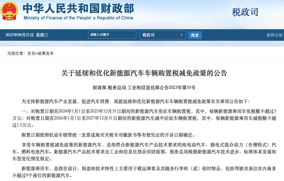 为了进一步稳定新能源车消费,车辆购置税免征福利得以延续,三部门继续发布公告,表示对购置日期在2024年1月1日至2025年12月31日期间的新能源汽车免征车辆购置税,其中,每辆新能源乘用车免税额不超过3万元,而对购置日期在2026年1月1日至2027年12月31日期间的新能源汽车减半征收车辆购置税,其中,每辆新能源乘用车减税额不超过1.5万元。