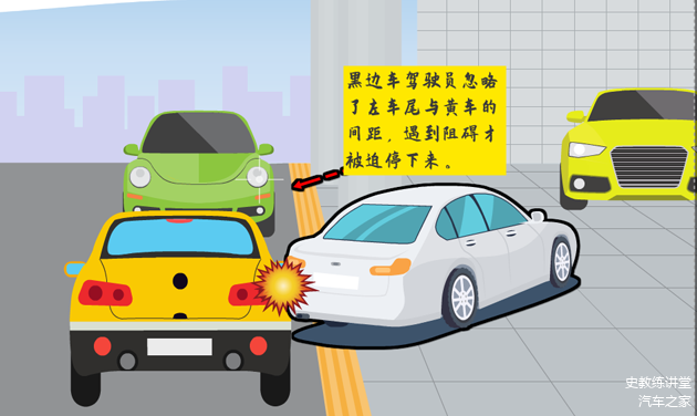 由于车停得过于靠后,左车尾遇到阻碍才停下来。如果车速慢,驾驶员可能没留意,就匆匆离开了。甚至等他回来时,都不见得发现。