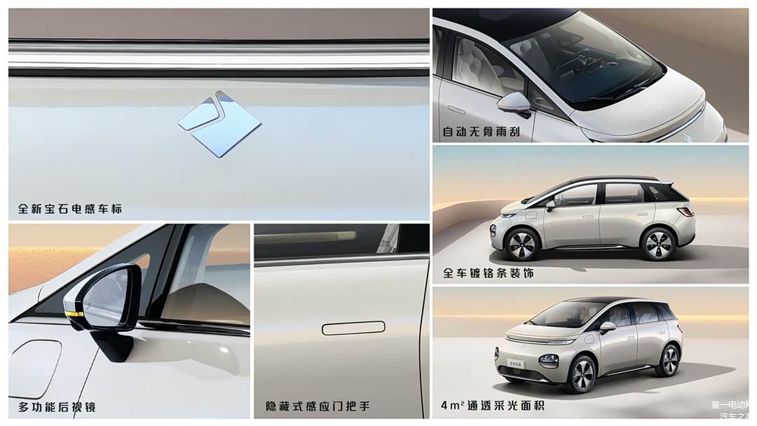 宝骏云朵还有更多精致外饰细节设计。新车采用全新宝石电感车标,美观大气,科技感十足。全车采光面积高达4㎡,通透舒适;全车7处镀铬条装饰,长达12m,让云朵车身熠熠生辉;配备多功能后视镜,集转向灯、电加热、电动调节、电动折叠、盲区提醒、360摄像头功能为一体;采用隐藏式感应门把手,车身外观更简洁,1m范围内即可感应开启,便捷智能;更有自动无骨雨刮,下雨自动感应开启,根据雨量的大小调节雨刮速度,梅雨天出行更舒心。