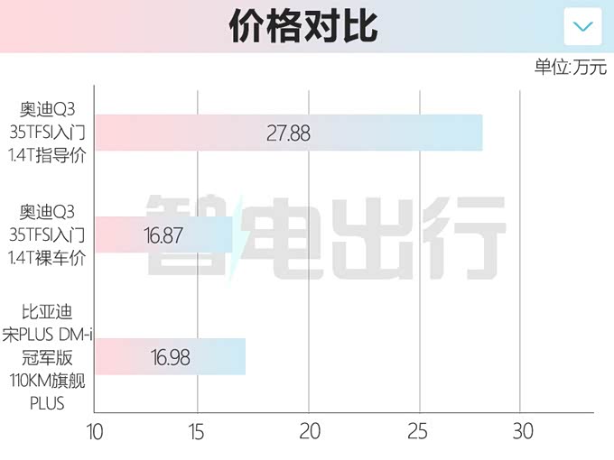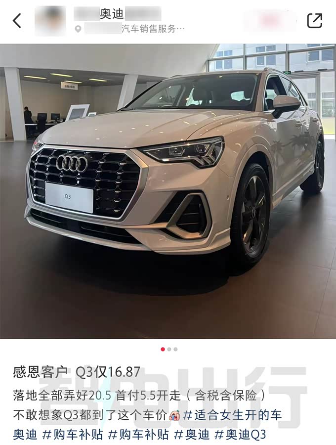 新车交强险购买数显示,2023年5月, 奥迪Q3(图片 | 参数 | 询价)销量4,757辆,相比近两年来单月销量峰值(2021年6月)下滑45.9%。经销商表示,官方指导价27.88万元的奥迪Q3 35 TFSI进取动感型(1.4T),目前裸车价低至16.87万元,相当于按6折出售,比比亚迪宋PLUS DM-i冠军版次低配车型的官方指导价(16.98万元)还便宜。