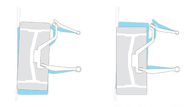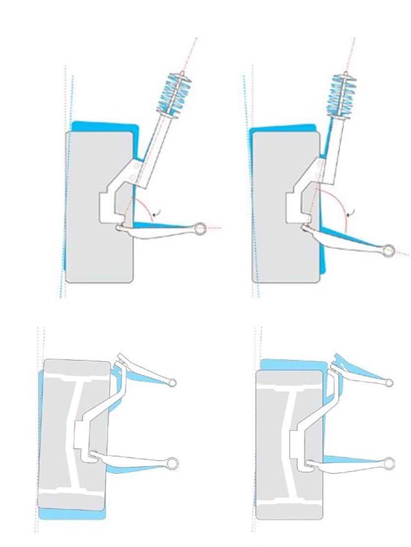 这样的问题对于双叉臂来说是不存在的,因为随着双叉臂悬挂的压缩,轮胎和地面的角度会越来越呈现出正八字的姿态,优化轮胎接地面积。