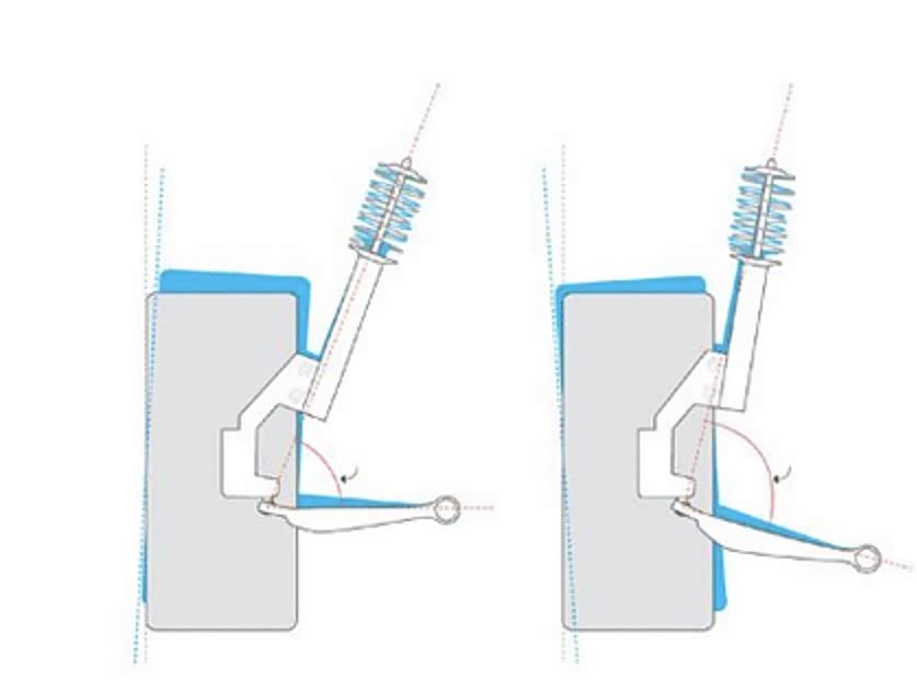 如图,麦弗逊悬挂在行程初段能够提供一定的负外倾角,让外侧轮胎在过弯时能够更好地抓地。但是超过一定行程,反而这个正八会变成倒八,不利于抓地力。