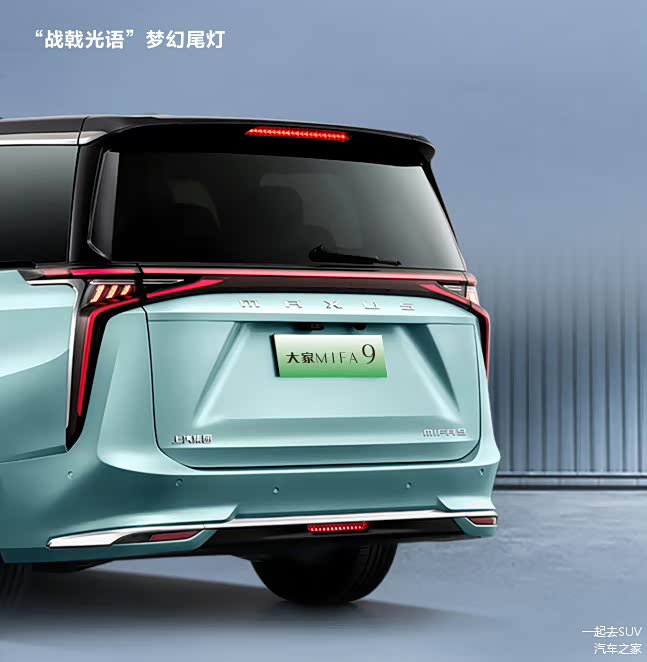 车身尺寸方面,MIFA9长宽高分别为5270×2000×1840mm,体型也颇为庞大。尾部则采用了流行的贯穿式尾灯设计,两侧灯组造型非常犀利,同样采用竖向布置,整体造型十分时尚。值得一提的是,新车增加了专属的冰翡翠绿车身颜色,内部含有金属粉,并且还配备了19英寸多辐条轮毂,整体豪华感上升了一个层次。