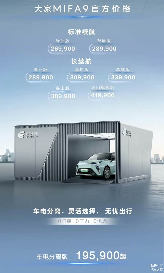 日前,上汽大通MAXUS大家MIFA9正式上市了,目前共推出了5款配置车型,售价区间在19.59-32.59万。该车定位中大型纯电MPV,并且新车还新增了换电功能,最快2分30秒便可完成一次换电。下面一起来了解一下这款车。