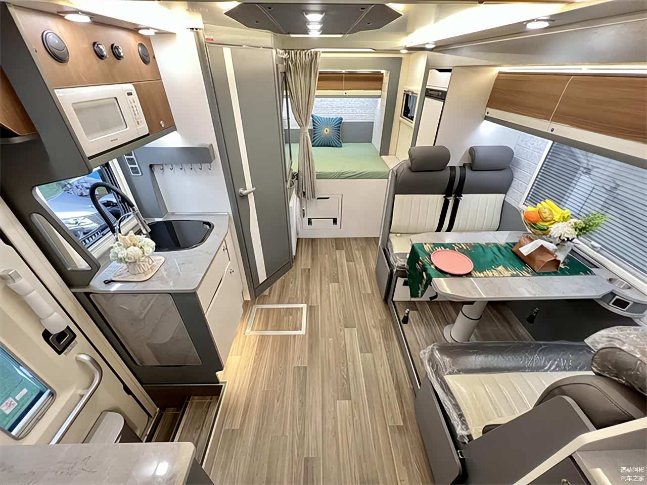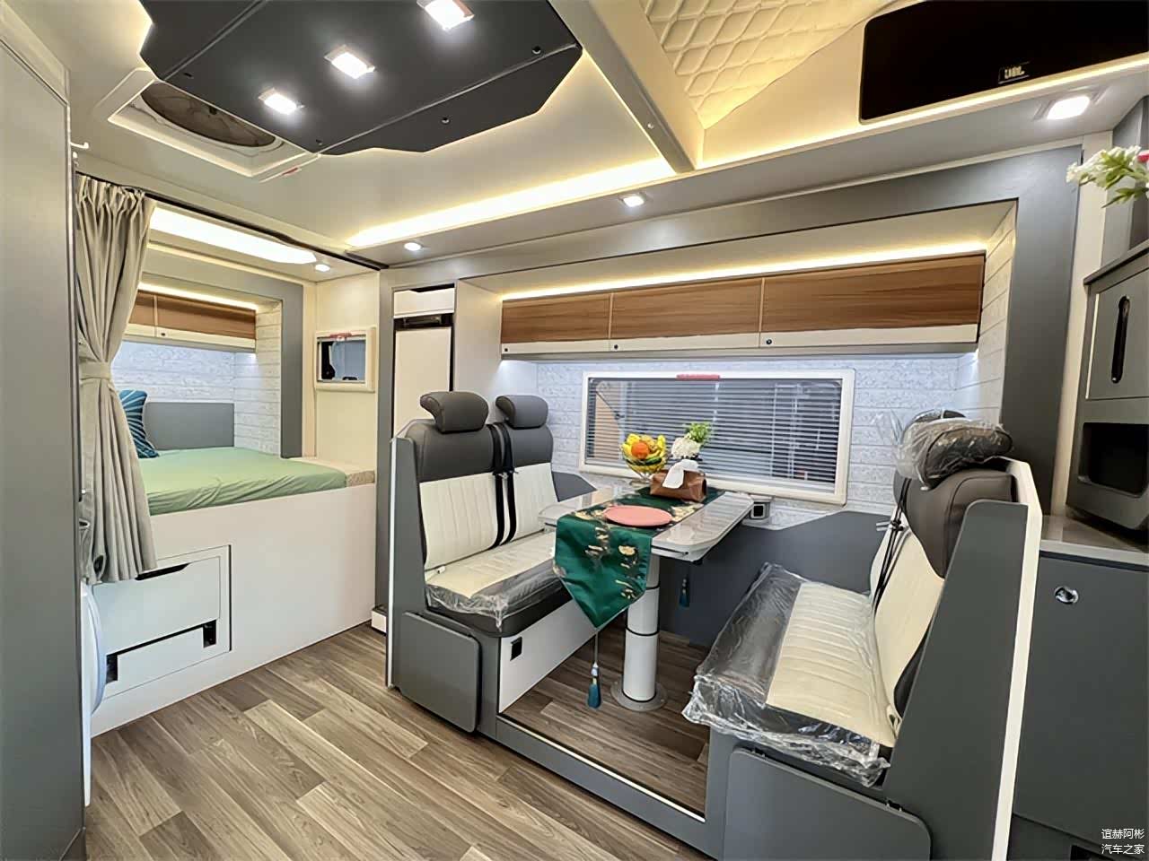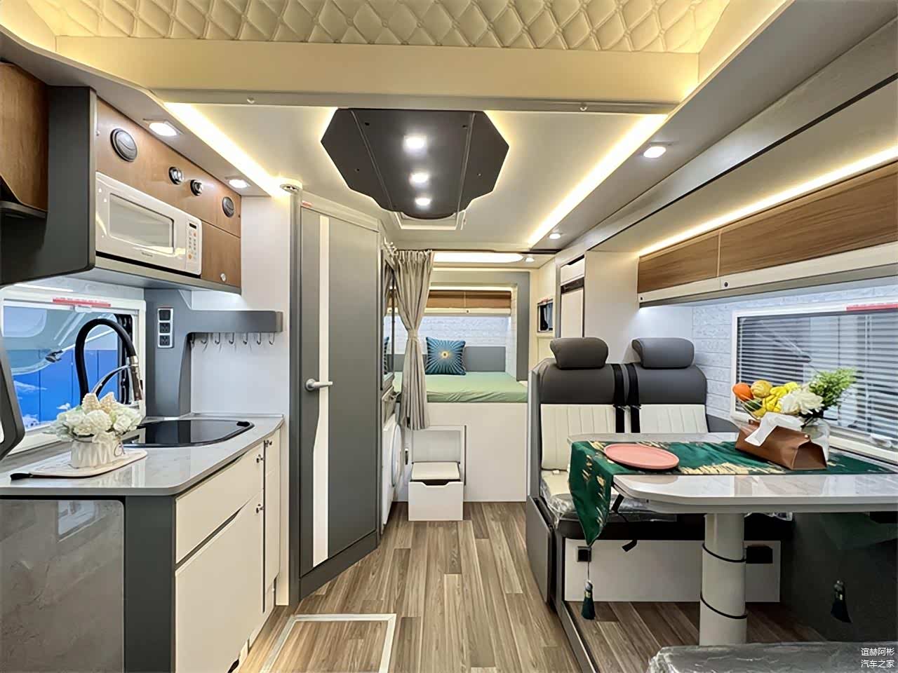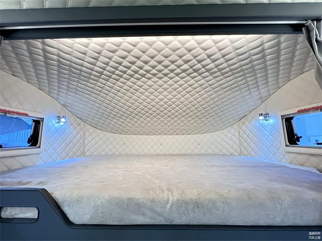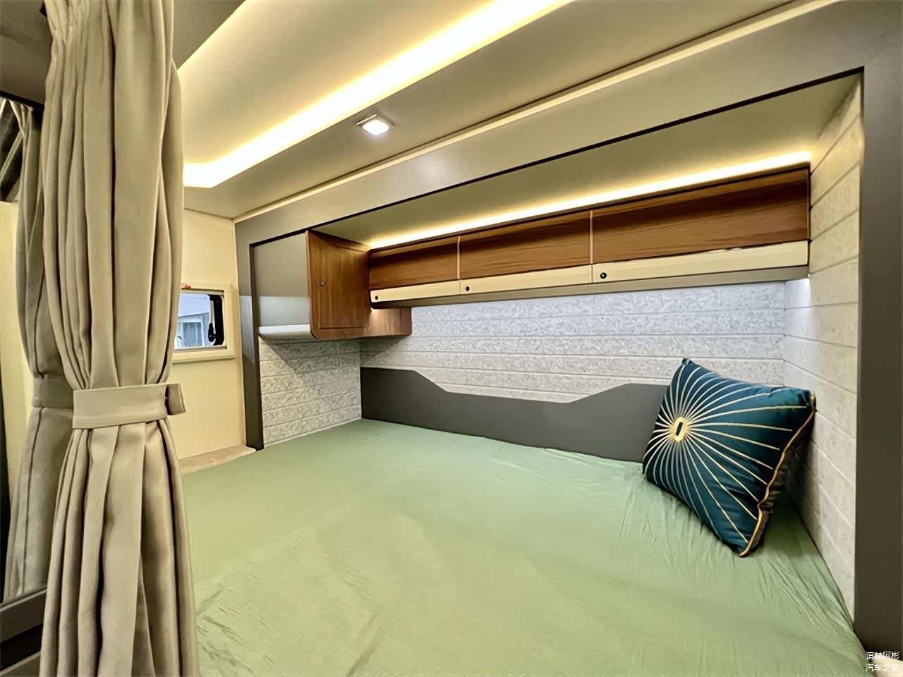干湿一体式卫浴区内部配备了赛特福德陶瓷电动粉碎马桶、洗手池、独立水龙头、浴室镜、储物格、淋浴花洒等设施,满足日常卫浴、洗漱所需。车尾主卧横置床完全拓出后尺寸更宽敞,尺寸为长2.1m 宽1.3m。轻松睡下两名成年人,两侧外推窗形成良好的空气流通循环,采光效果也更佳,顶部吊柜上安装有一圈氛围灯带,暖黄色灯源尽显温馨。