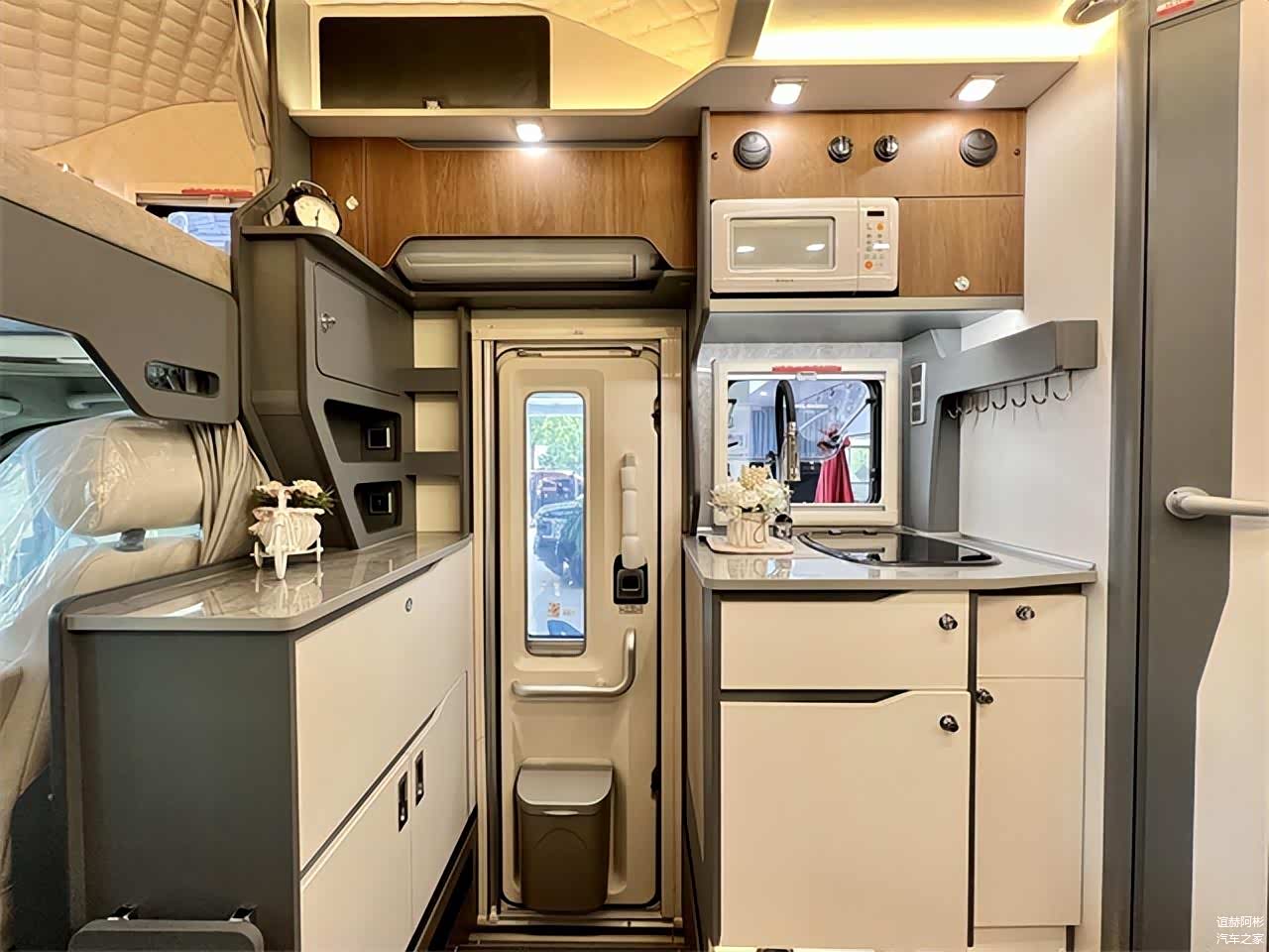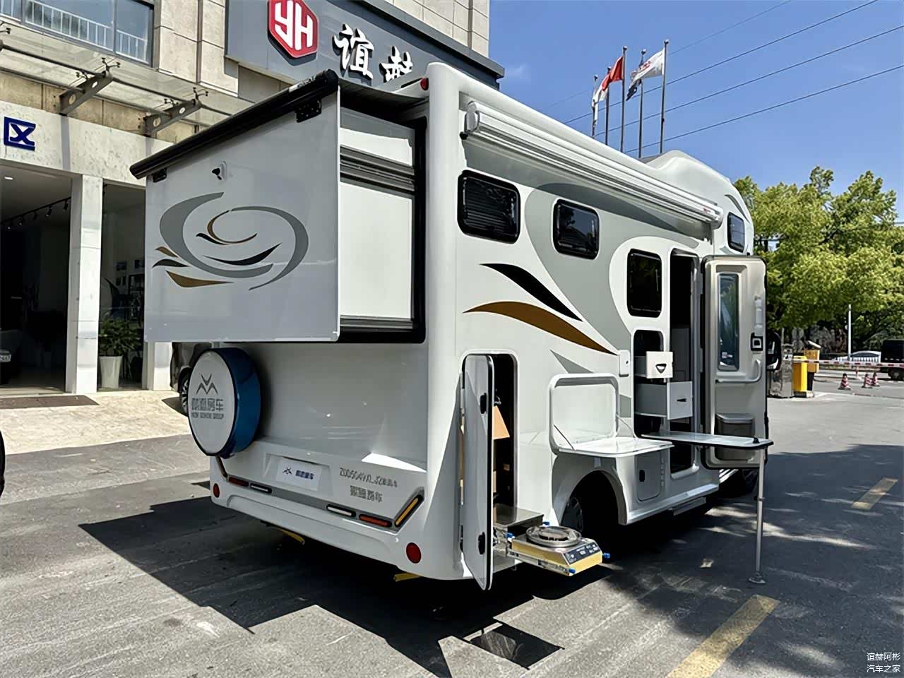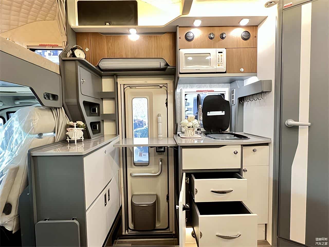 车辆外侧的配置主要集中在车身右侧,包括有露营设施、外置厨房设施及储物空间。车外厨房区域的配置还是很人性化的,包括有内外两用的双层储物抽屉、专门的调料格、车外取水口、取电口、翻折式的桌板及抽拉式的灶台,很照顾我们日常的使用。而车辆尾部的贯通式大空间储物仓,也专门开有一个后置的大尺寸舱门,平时拿取行李更为方便。