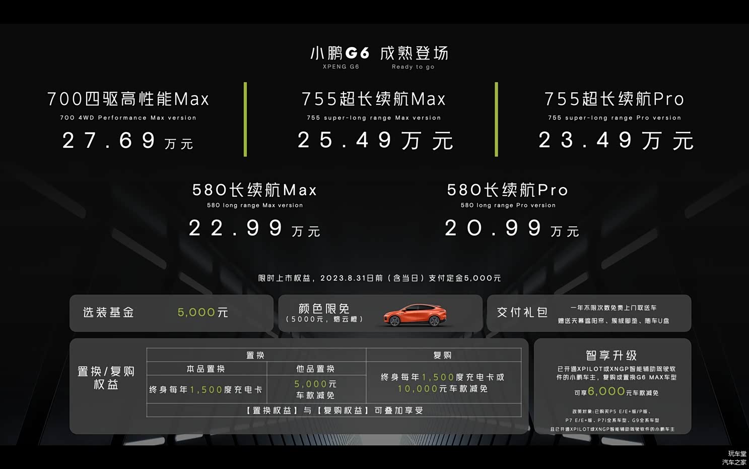 动力方面,小鹏G6提供单电机和双电机两种动力,其中,其中单电机版本最大功率218kW,峰值扭矩440Nm,匹配容量为66kWh的磷酸铁锂电池或87.5kWh的三元锂电池,纯电续航为580km和755km,零百加速6.6秒。双电机性能版综合最大功率358kW,综合扭矩660Nm。零百加速可达到3.9秒,搭87.5kWh的三元锂电池,最高续航达到755km。