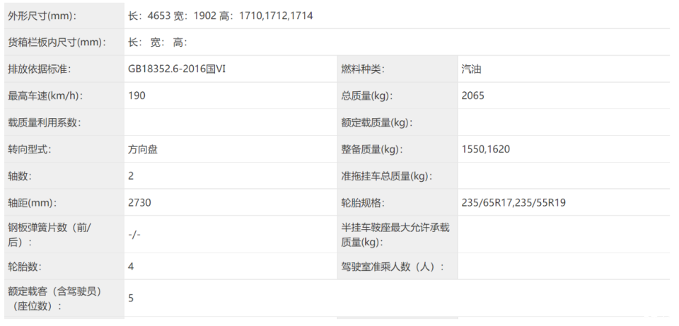 车身侧面采用平直线条,硬朗的腰线搭配方正的轮眉增添整车的硬派属性。车身尺寸方面,新车长宽高分别为4653/1902/1710、1712、1714mm,轴距为2730mm,相比老款车型整体尺寸都有增加。轮胎规格方面,该车将提供235/65 R17和235/55 R19供消费者选择。