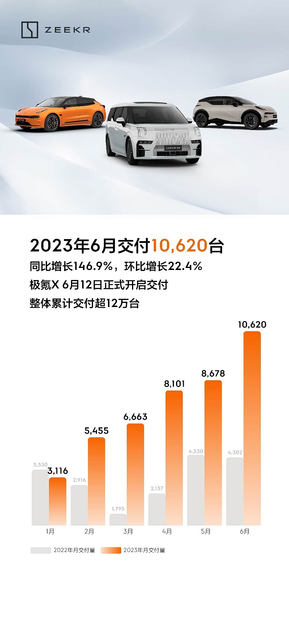 在刚刚过去的6月,极氪品牌交付10620台,同比增长146.9%,环比增长22.4%,纵观整个上半年,极氪的交付量始终在持续增长,在6月之前,极氪仅凭借001和009两款车就持续刷新交付速度和数量,创下新势力交付全新纪录,同时在细分市场傲视群雄,这对于一个立志于走高端化并主打时尚的品牌而言并不容易,何况是一个中国品牌。极氪的受欢迎程度可见一斑,这也是国产品牌的现象级表现,立下全新的标杆。