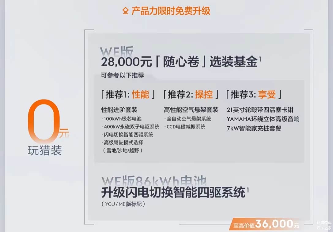 除此之外,YOU版车型可免费选装价值3.5万元的Z-Sport运动套装,ME版车型可以免费选装高性能空气悬挂套件。刺激的来了,入门的WE版车型可以享受价值2.8万元的限时“随心卷”选装基金,可以选到100度电池包、双电机以及空气悬架等曾经高配才有的项目。