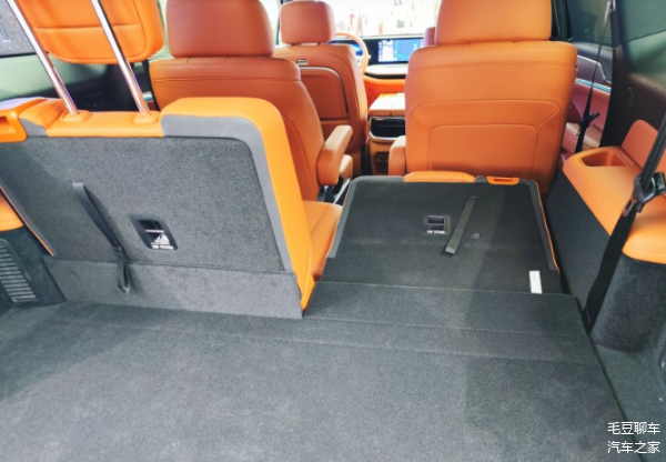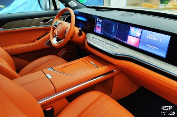 内饰方面,整个内饰设计很简洁还富有科技感,中控配有12.3寸液晶仪表和27寸中控屏和副驾屏组成的三联屏设计,搭载了新一代Coffee OS2智能座舱系统,中控屏下方保留了部分实体按键,便于操作,三幅式方向盘造型很大气,触感也很舒服,中控扶手区配有手机无线充电板和隐藏式储物格、杯架,使用起来很方便,车内座椅采用2 2 2的6座布局,新车还配备采用零重力座椅的女王副驾,还有腿托、小桌板等。