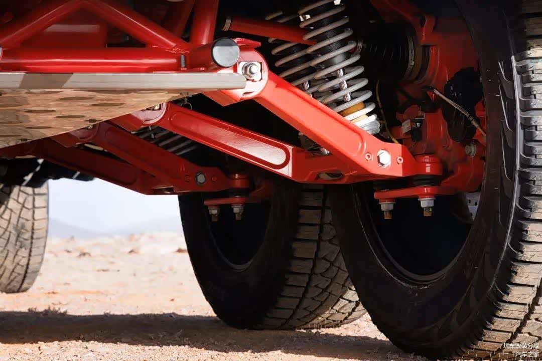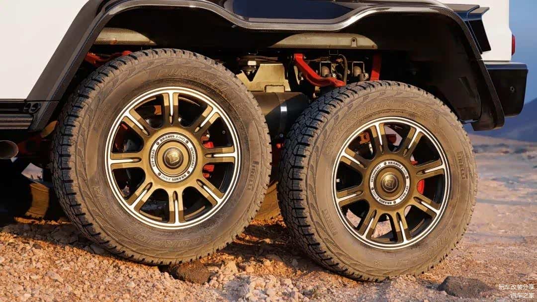 该车基于AMG G63打造,底盘方面,悬挂全采用高强度定制部件,包括每个轮组采用双避震作为支撑,离地间隙增加到了47.3cm。轮毂采用22英寸锻造轮毂,搭配越野轮胎。