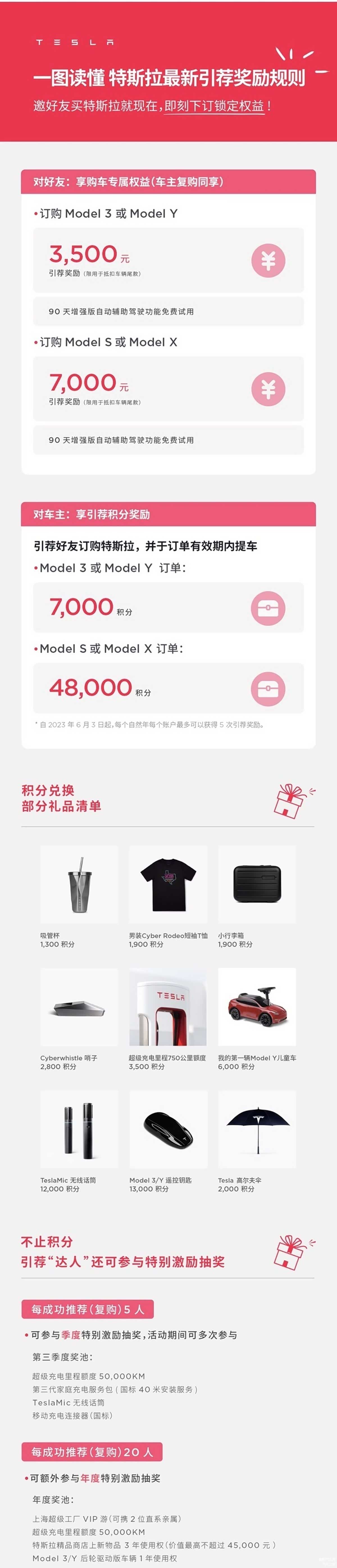 2023年7月9日,特斯拉公布最新引荐购车奖励规则,引荐好友购买特斯拉Model 3/Y或Model S/X,购车人可分别获得3500元或7000元引荐奖励用于抵扣车辆尾款(车主复购同享),同时还可获得90天增强版自动辅助驾驶功能免费试用权;引荐人可获得积分奖励用于兑换超充额度、儿童学步车等。此外,每成功推荐(复购)5人或20人,还可参与季度或年度特别激励抽奖,其中,年度奖池内含Model 3/Y后轮驱动版车辆1年使用权等。