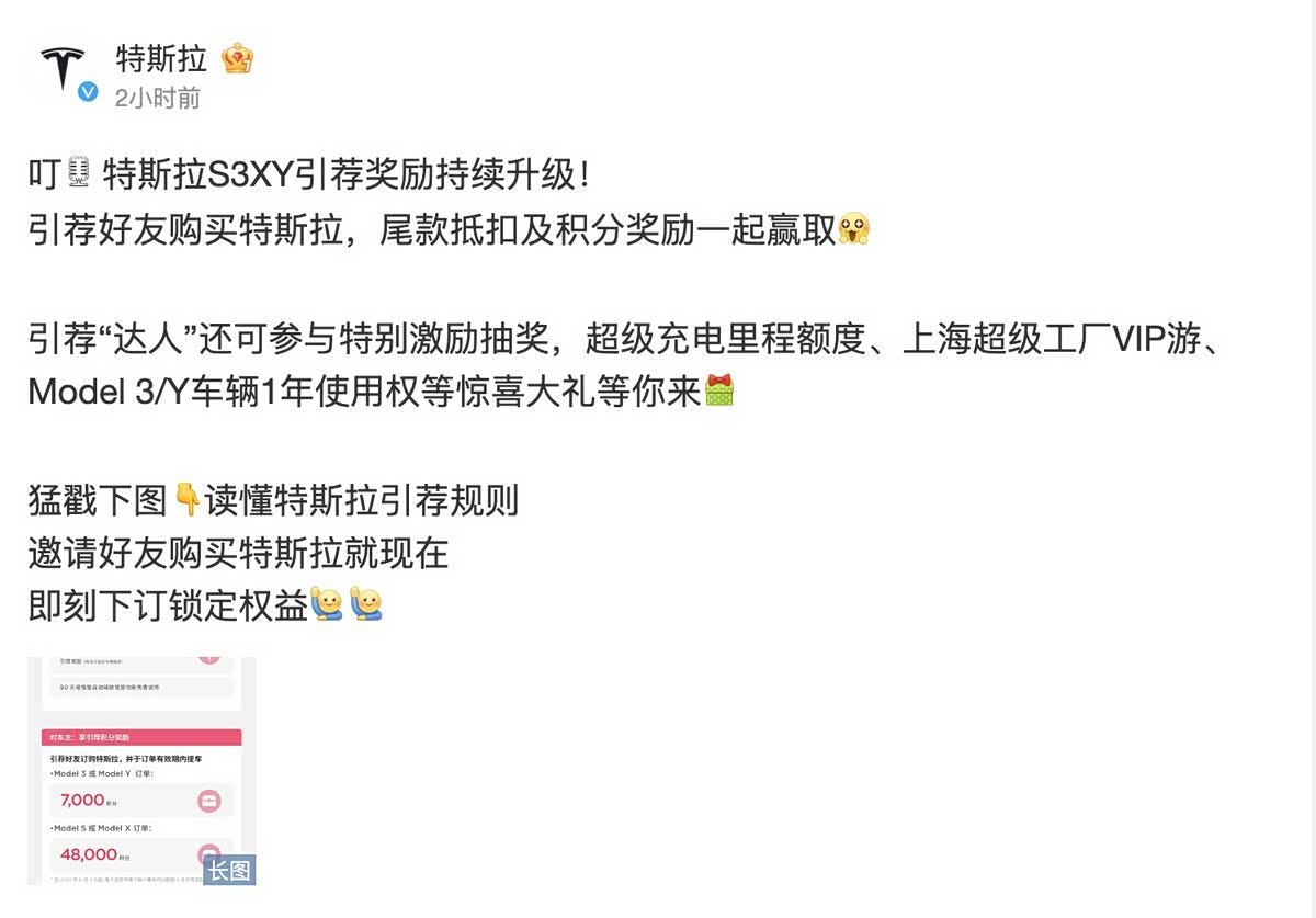 此前,7月7日,特斯拉官方微博宣布,即日起升级Model 3/Y引荐奖励。成功引荐好友下订并提车,购车人可获得3500元引荐奖励及90天EAP免费试用权,引荐人可享7000积分奖励、可兑换超充额度、儿童学步车等。