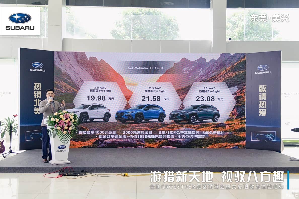 游猎新天地,视驭八方趣。7月8日,东莞美兴斯巴鲁在东莞国际汽车城展厅举办了全新CROSSTREK品鉴试驾会暨关爱眼健康体验活动。品鉴活动巧妙地结合护眼科普,以Eyesight功能为出发点,与东莞光明眼科医院一同为现场嘉宾带来了一场别开生面的爱眼互动体验。