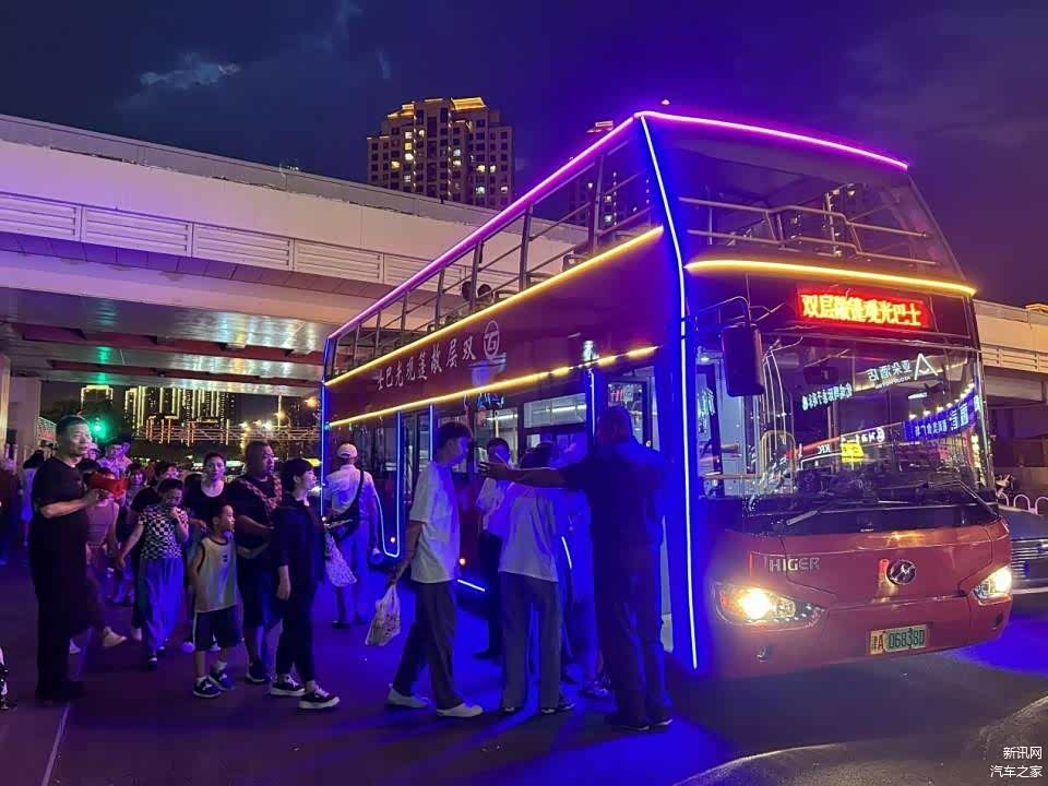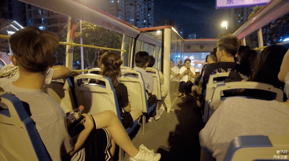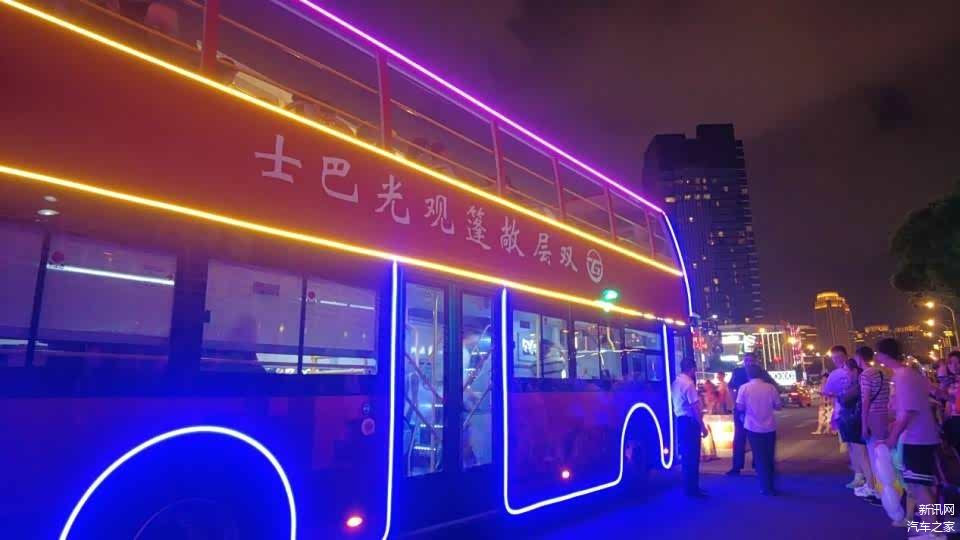 夜间票价每张50元,记者买完票,足足排了一个半小时的队才上车,这也足以证明这条线路的火爆。记者乘坐的这辆双层敞篷观光巴士是一辆苏州金龙海格品牌的纯电动车型。