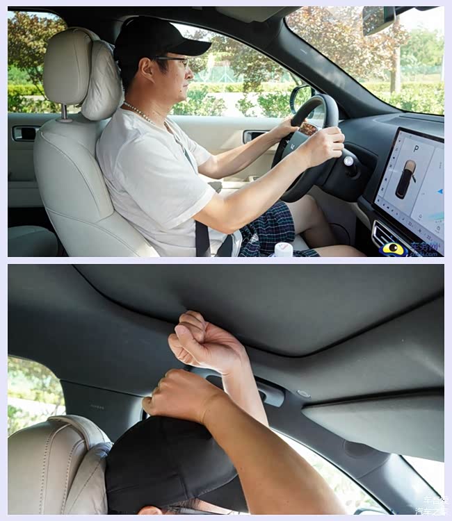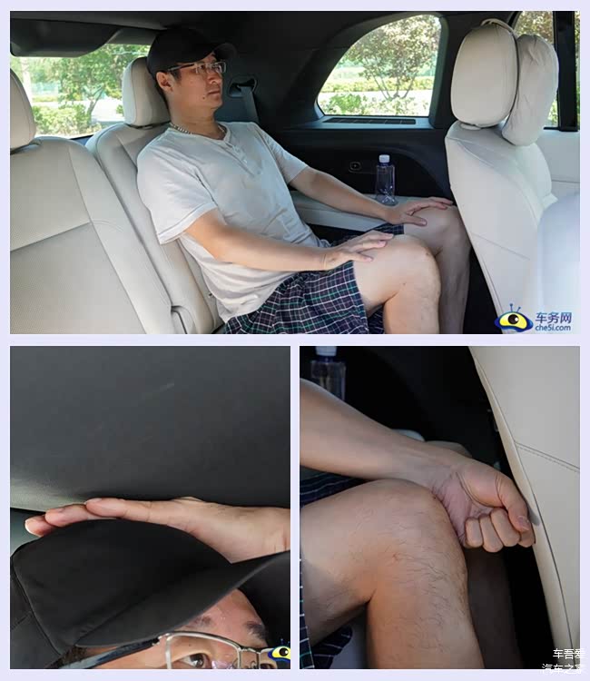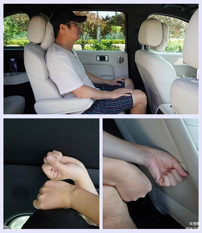 乘坐空间方面,体验者身高178cm,首先来到前排,将座椅调至到舒适度高的位置后,头部空间为2拳左右,同一体验者,将前排座椅不变,来到第二排,头部空间为2拳空间,腿部空间有2拳左右的距离,同时,我们让体验者来带第三排,头部有1指的空间,腿部有将近1拳的余量,整体空间表现还是不错的。理想L8整体提供了充足的腿部和头部空间,乘坐体验很好。