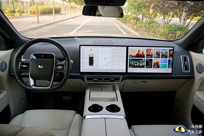 中控台采用了双15.7英寸3K分辨率的LCD双连大尺寸液晶屏幕内部的菜单逻辑清晰,上手难度较低。 同时,集成了多媒体系统和车辆控制功能,操作方便直观。