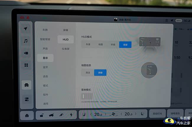 高规格的HUD抬头显示完美解决了行车信息显示的问题,视线转移更小也更安全。HUD抬头显示分别会显示导航信息、智驾功能、基础车速三个板块等。亮度可调节,面积基本上和传统仪表差不多,同时内容可以通过设置来调整显示的板块。