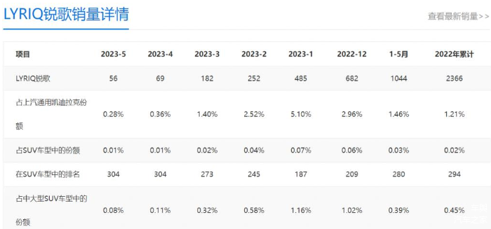 凯迪拉克lyriq锐歌是去年6月6日正式上市,作为凯迪拉克奥特能平台首款纯电车型,它被寄予厚望。据数据显示,2023年5月份,凯迪拉克锐歌的单月零售销量仅为56台,4月份单月零售销量也只有69台,今年1-5月LYRIQ锐歌累计的销量仅1044辆。